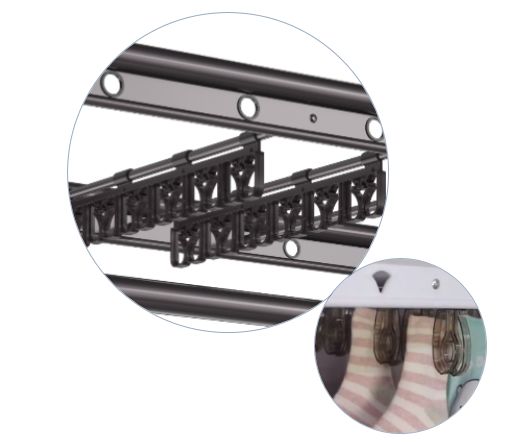 好太太奶爸機(jī),設(shè)計(jì)了6桿橫向的小晾桿,4排母嬰夾,與大人的晾衣空間不沖突,實(shí)現(xiàn)了寶寶的獨(dú)立晾曬空間。