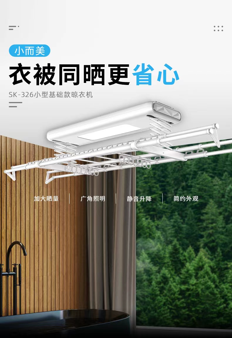 多功能智能晾衣機SK-327,晾衣、烘干、消毒、晾被、風(fēng)干、照明,一機六用,為織物護理提供全方位細致化服務(wù)。